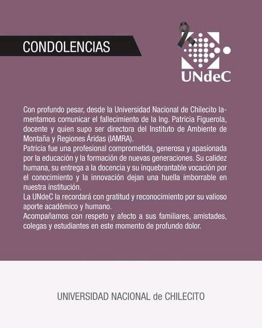 Con profundo pesar, desde la Universidad Nacional de Chilecito lamentamos comunicar el fallecimiento de la Ing. Patricia Figuerola, docente y quien supo ser directora del Instituto de Ambiente de Montaña y Regiones Áridas (IAMRA)