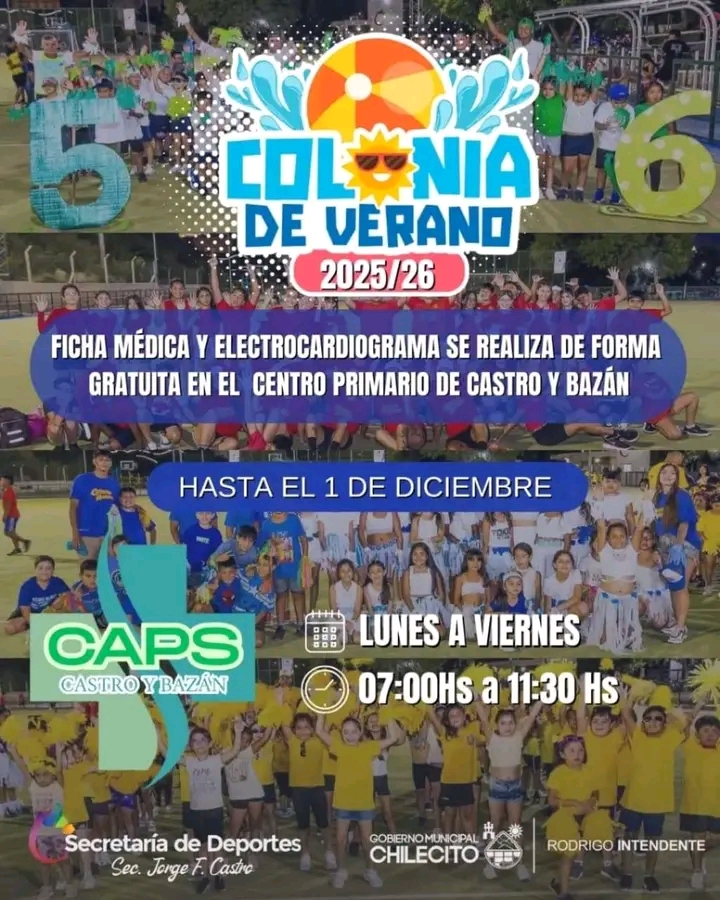 La Secretaría de Deportes informa que en el Centro de Atención Primaria de Salud de Barrio Castro y Bazán se realizan, de manera gratuita, los electrocardiogramas y las fichas médicas, requisitos fundamentales para completar la inscripción para la Colonia Municipal de Verano.
