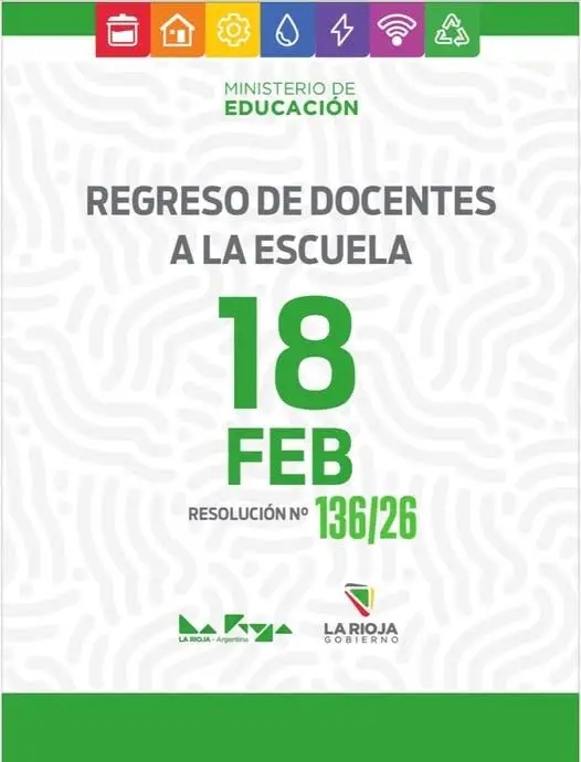 El Gobierno de La Rioja a través del Ministerio de Educación informa que mediante Resolución N 136/26 dispuso postergar el regreso de los docentes a las escuelas para el día 18 del corriente mes.