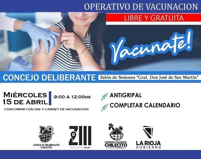 El Concejo Deliberante de Chilecito y Zona Sanitaria III invitan a la comunidad a participar del operativo de vacunación que se llevará a cabo este miércoles 15 de abril, de 9:00 a 12:00 horas, en el Salón de Sesiones “Gral. Don José de San Martín”.
